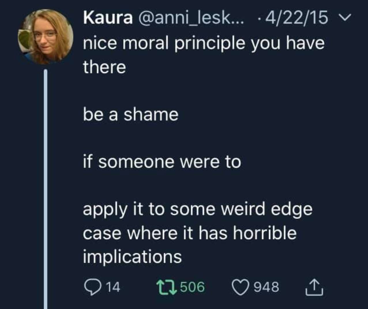 I sympathize with this, but in fact this sort of is my complaint. Most rule systems (such as state laws, or employee handbooks) purport to lay out a clear and unambiguous standard, but in practice people do eventually start to accrue a sort of miasma of demerit-colored blegh even if they really were just trying to do what they were told, and can’t understand why following the directions they were given results in people glaring at them over and over again. Even if you win each individual battle, if you’re not doing thresholding on purpose, and are instead just a bewildered autistic, it’s not pleasant to find yourself called up in front of HR every time someone’s grumpy at you for following protocol to the letter, and it’s not pleasant to have people turn on you socially even if they can’t actually figure out a way to kick you out.