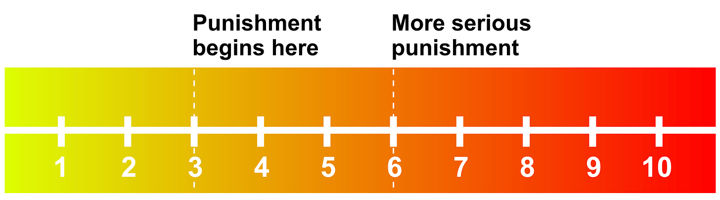 …all of these things (and more that I haven’t listed) come together in a complicated and often implicit calculation that cashes out to a gestalt sense of “how bad” a given behavior was. Something that’s a 4 on some arbitrary linear scale might end up being treated like a 3 because of various uncertainties, or like a 5 because they’ve been caught doing 4s before and (apparently) need to be taught a lesson.